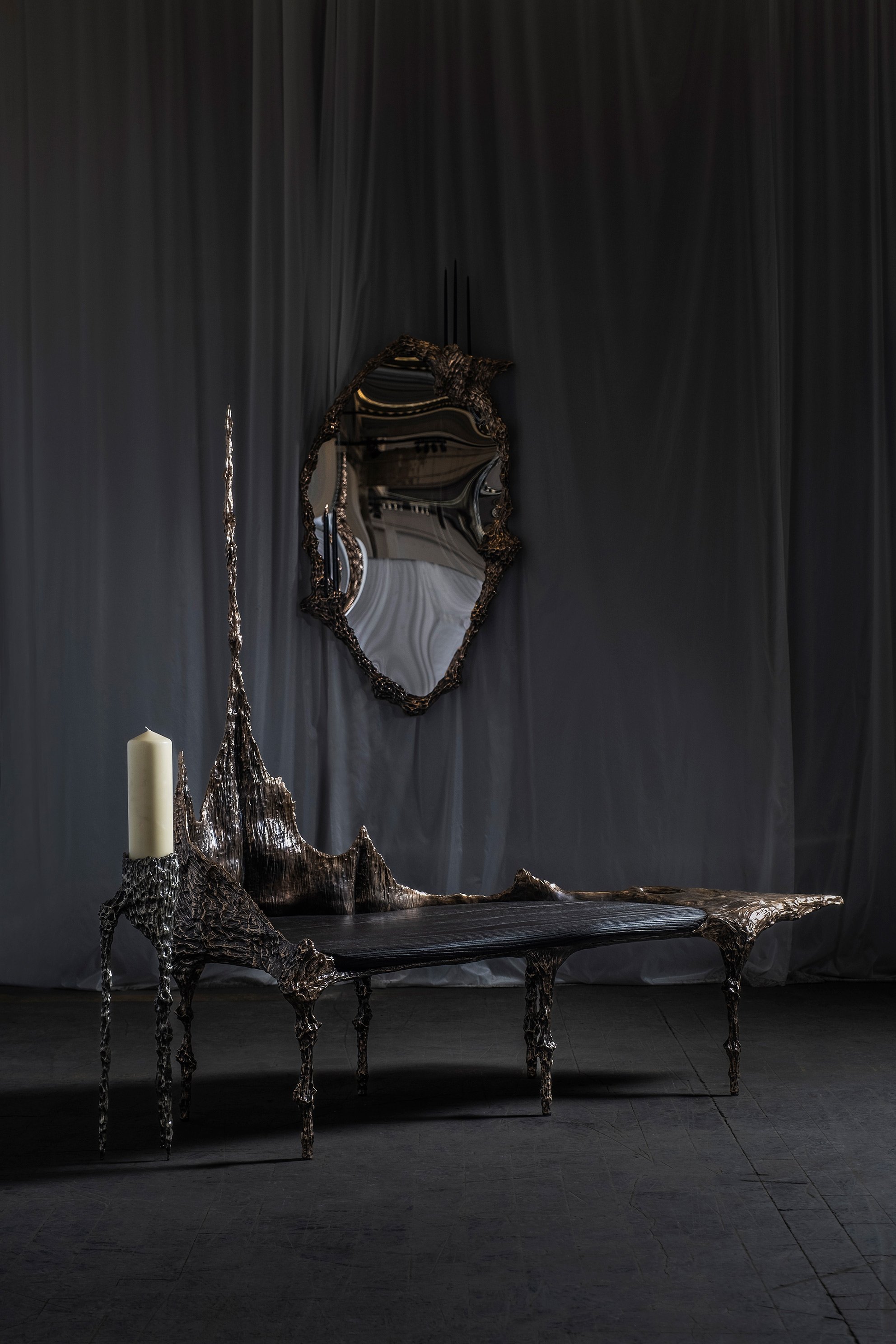 Within this ethereal maze, Guillon’s bronze pieces appeared like sacred fragments from an archaic future. Their tactile surfaces and dramatic silhouettes found resonance in the brutal minimalism of the venue, embracing both the elegance of destruction and the poetry of suspended time.